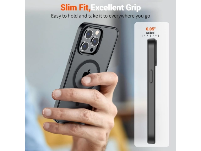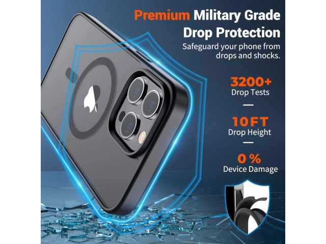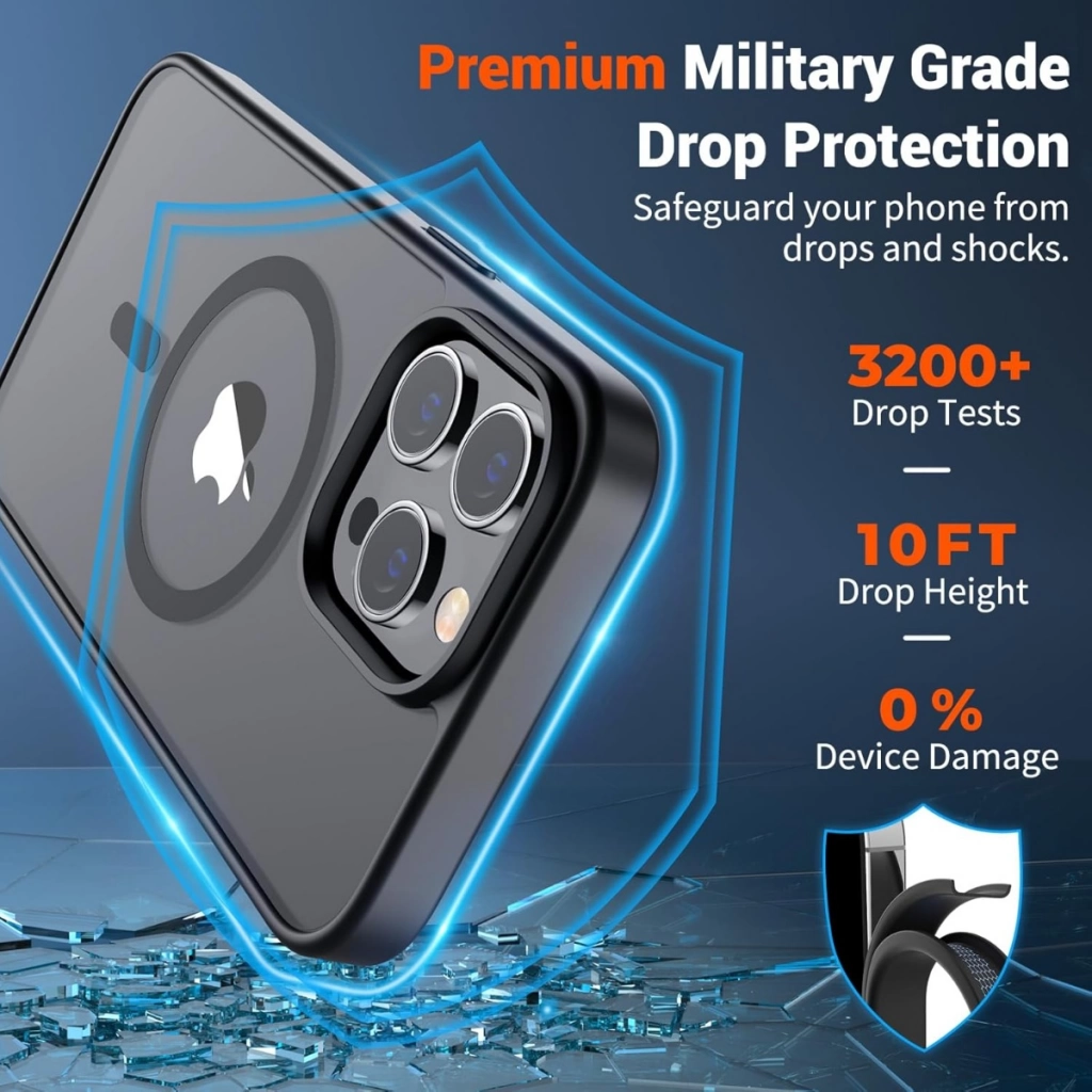 El acabado negro mate antideslizante mejora el agarre y evita marcas de huellas, manteniendo tu iPhone con un aspecto limpio y profesional. Gracias a su compatibilidad con MagSafe, podrás usar cargadores y accesorios magnéticos sin quitar la funda.